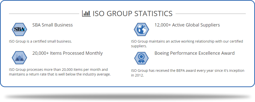 ISO Group’s mission centers on its dedication to our clients, and providing an exceptional quality experience. ISO Group provides industry leading quality control, maintaining a part return rate far below industry averages. Our ISO9001 and AS9120 certified Quality Management System manages thousands of parts every day. All items are barcoded, photographed and 100% inspected, with manufacturer certifications and traceability available.